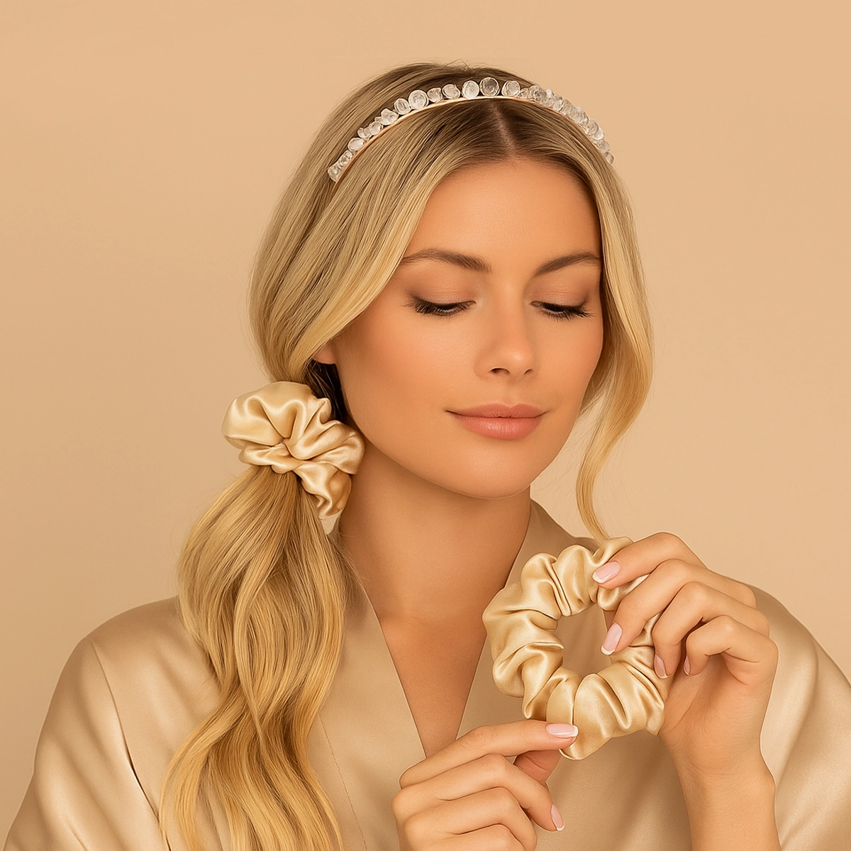 Elegancka opaska zdobiona naturalnym kryształem górskim oraz jedwabna gumka w odcieniu jasnego złota tworzą zestaw, który dba o włosy z delikatnością i klasą. Idealny jako prezent pełen piękna, harmonii i intencji 🎁