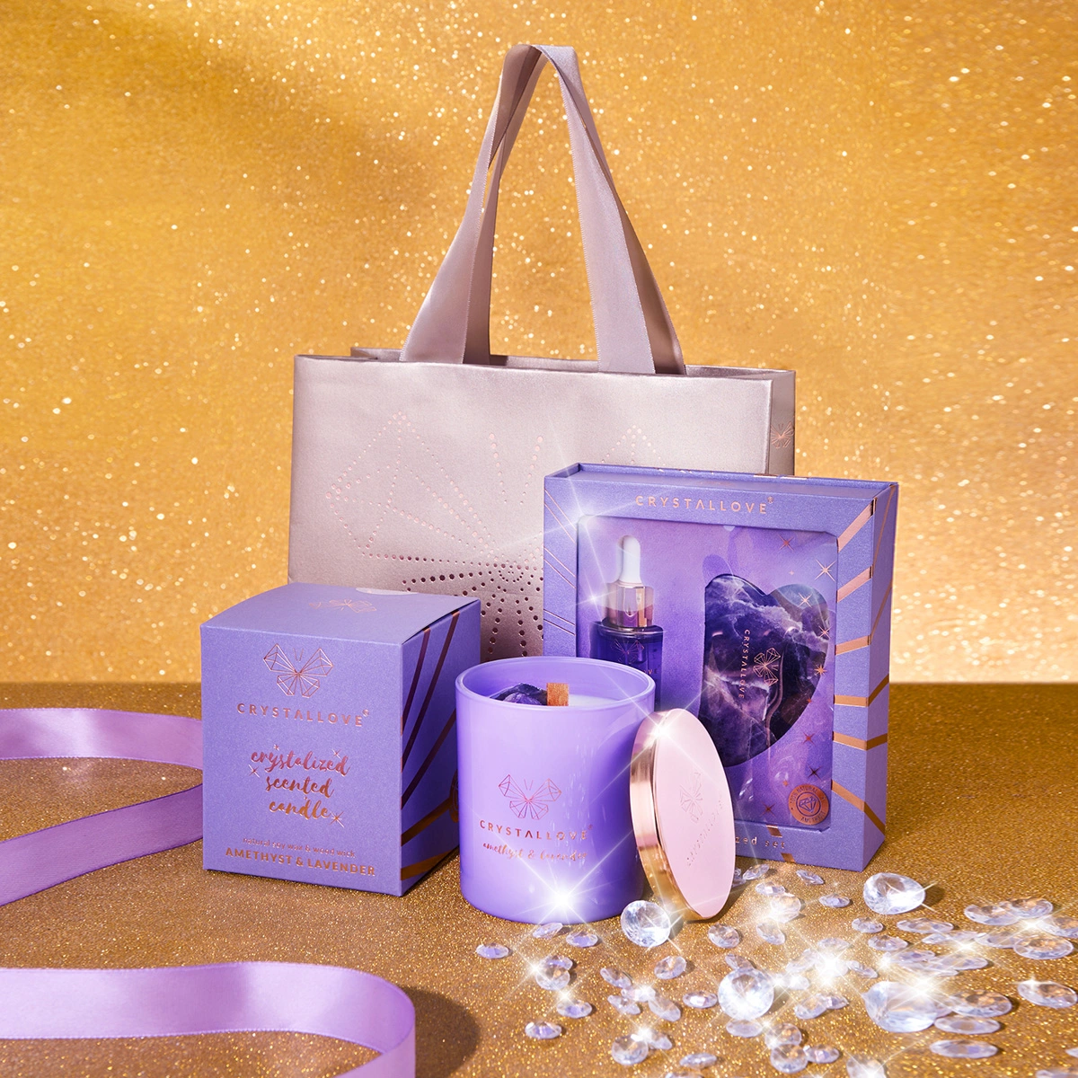 Świąteczny zestaw CRYSTALLOVE z ametystem to harmonijne połączenie pielęgnacji i relaksu. Zawiera odżywcze serum do twarzy z ametystem, płytkę gua sha wspierającą naturalny lifting oraz aromatyczną świecę sojową z ametystem i lawendą. Całość dopełnia elegancka torebka prezentowa.